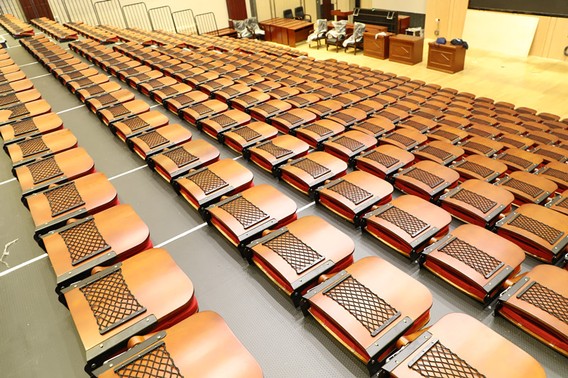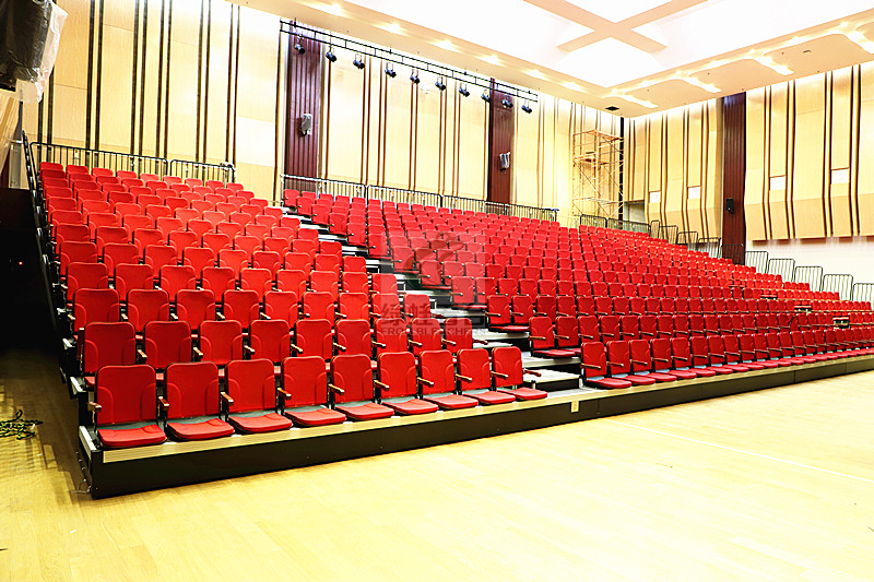 該看臺(tái)為電動(dòng)伸縮看臺(tái),配置前置式包棉軟包座椅,帶扶手,為滿足客戶特殊需求,在座椅背面增加網(wǎng)兜設(shè)計(jì)。看臺(tái)整體與多功能廳其他設(shè)施搭配合理,整體美觀大方。