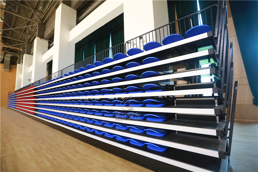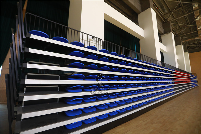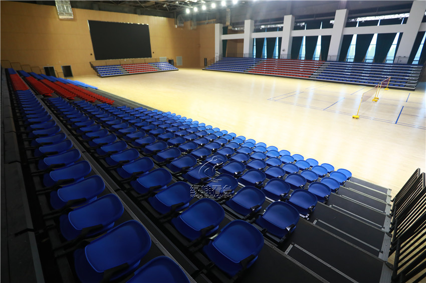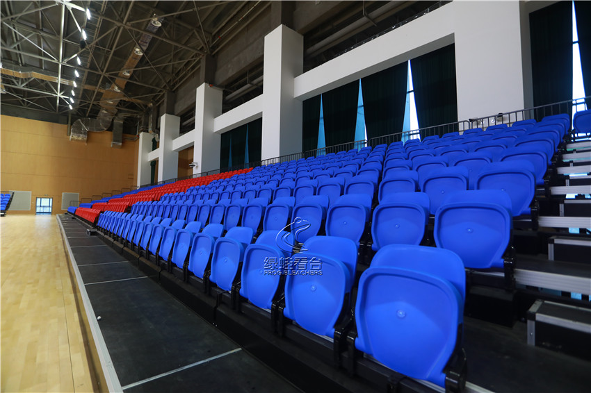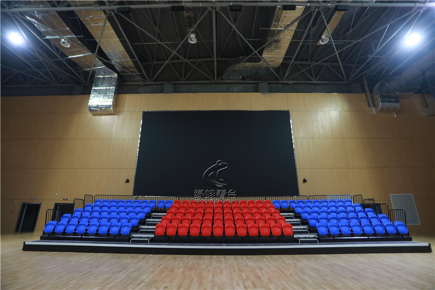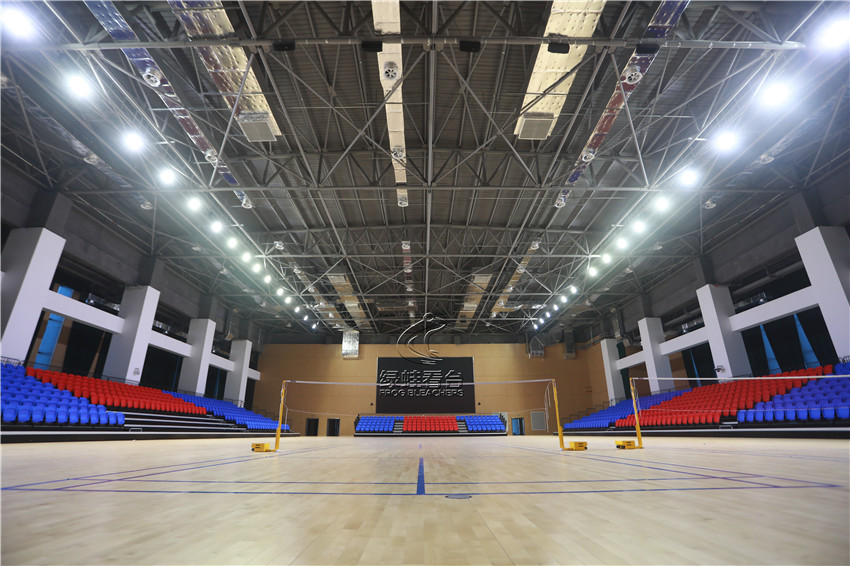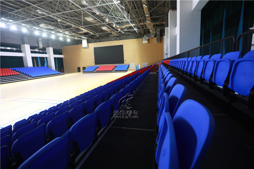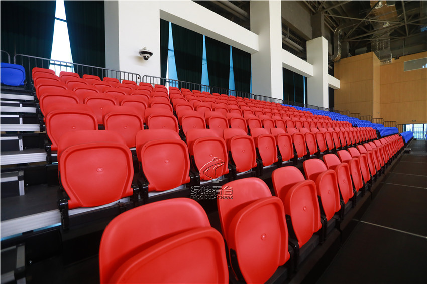 綠蛙看臺承接南京市第一中學的看臺搭建安裝及調(diào)試項目,采用全自動電動伸縮看臺及氣輔式翻板座椅,后置式安裝,共有看臺座位1088座,踏步56級。安裝完成之后,場館內(nèi)可容納更多的師生觀眾,而可伸縮的看臺最大程度利用了場館的空間,可以更好的再場館開展各項活動,豐富學校生活。亮眼的紅藍座椅配色,使得場館更具活力