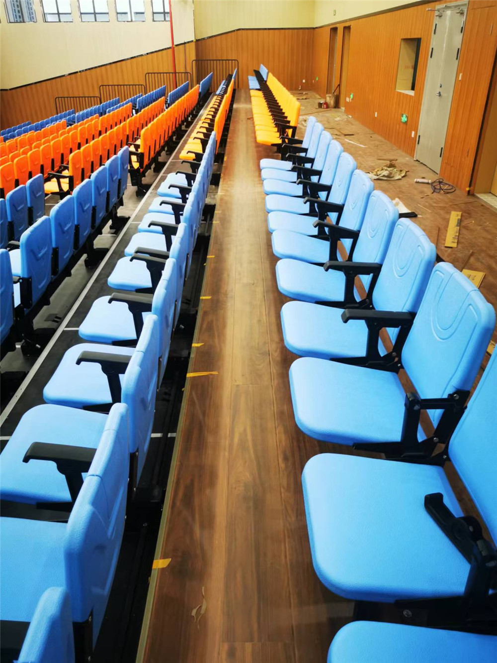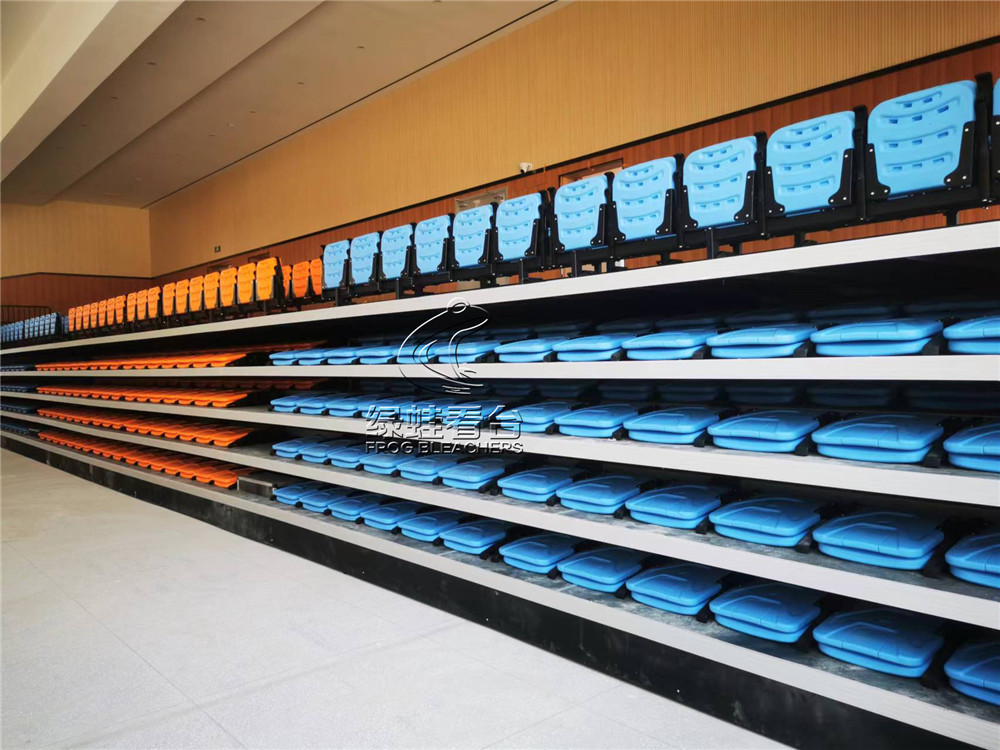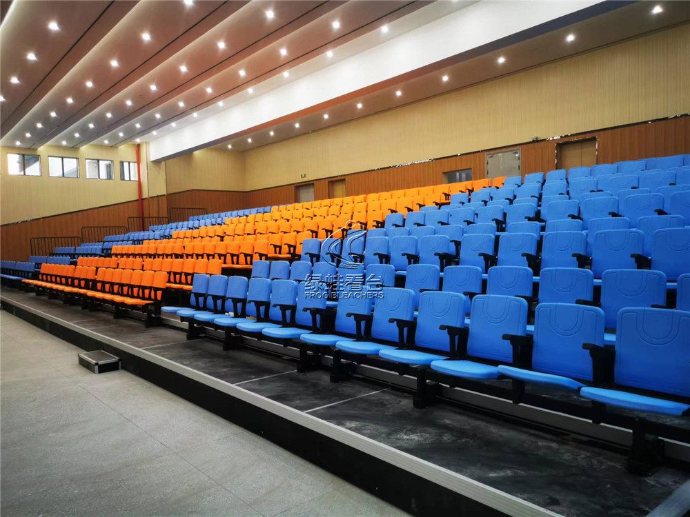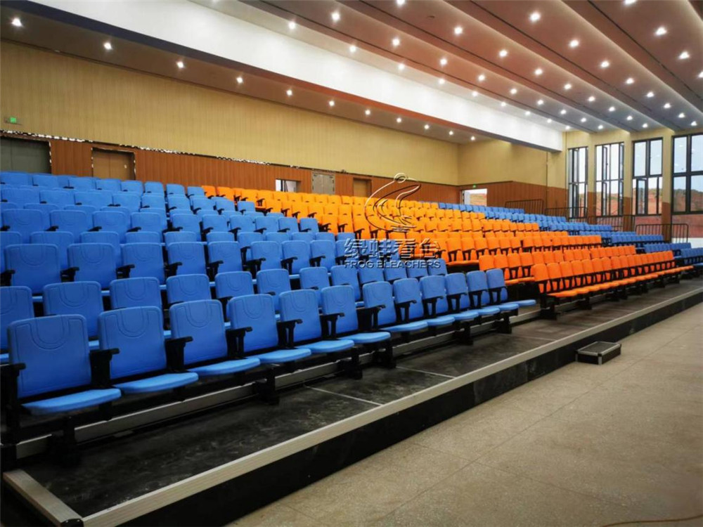 活動看臺采用鋼焊接組裝連接,所有安裝用鋼件均采用靜電噴涂處理,層寬1800mm。首層高330mm,錯(cuò)層高400mm, 活動看臺踏板材料選用17mm防火防滑舞臺板,活動看臺為電動控制,保證左右行走距離一致,在伸展與回縮中無定向跑偏、卡死、打滑、跳齒現(xiàn)象。活動看臺觀眾席采用高靠背吹塑翻板座椅,后置式安裝方式,座距490mm,后邊和側(cè)邊(第一層除外)加安全防護(hù)欄桿,欄桿高度為1100mm;并且看臺展開時(shí),即處于使用狀態(tài)下,觀眾可通過伸縮看臺的走道直通二樓區(qū)域。