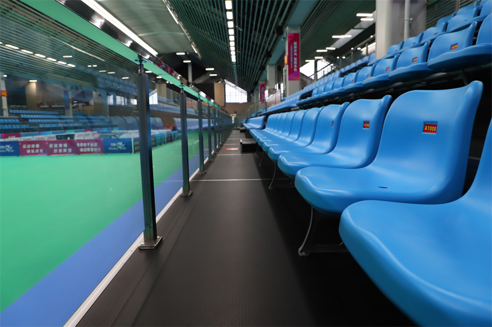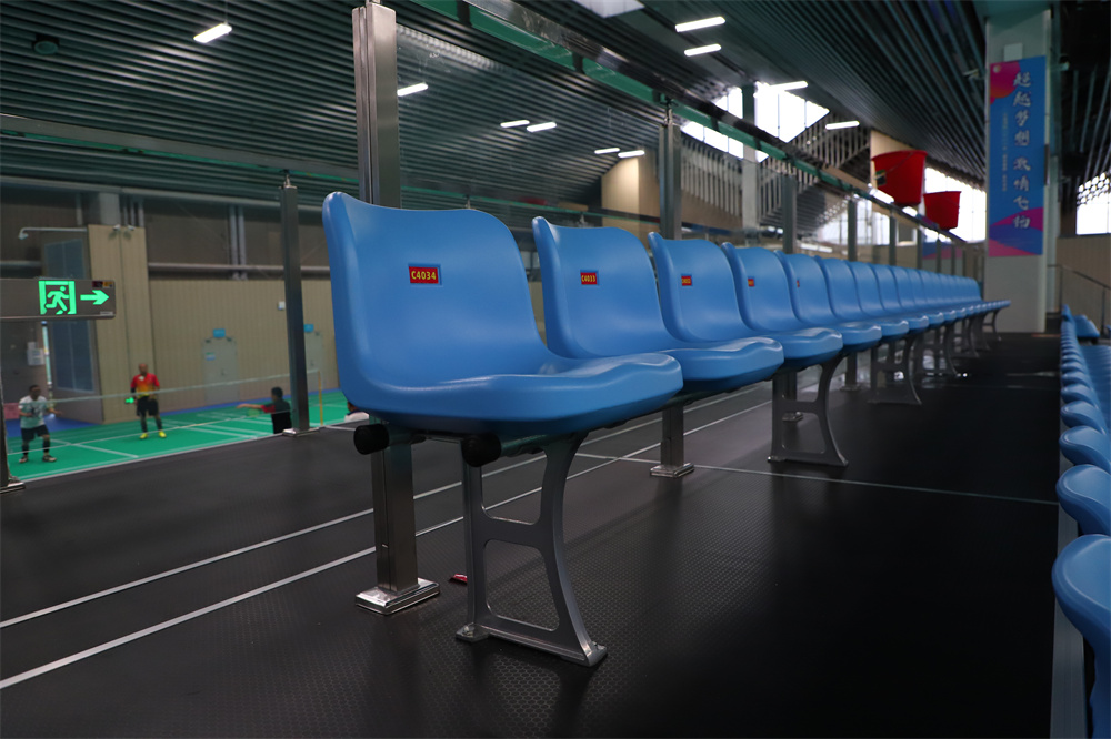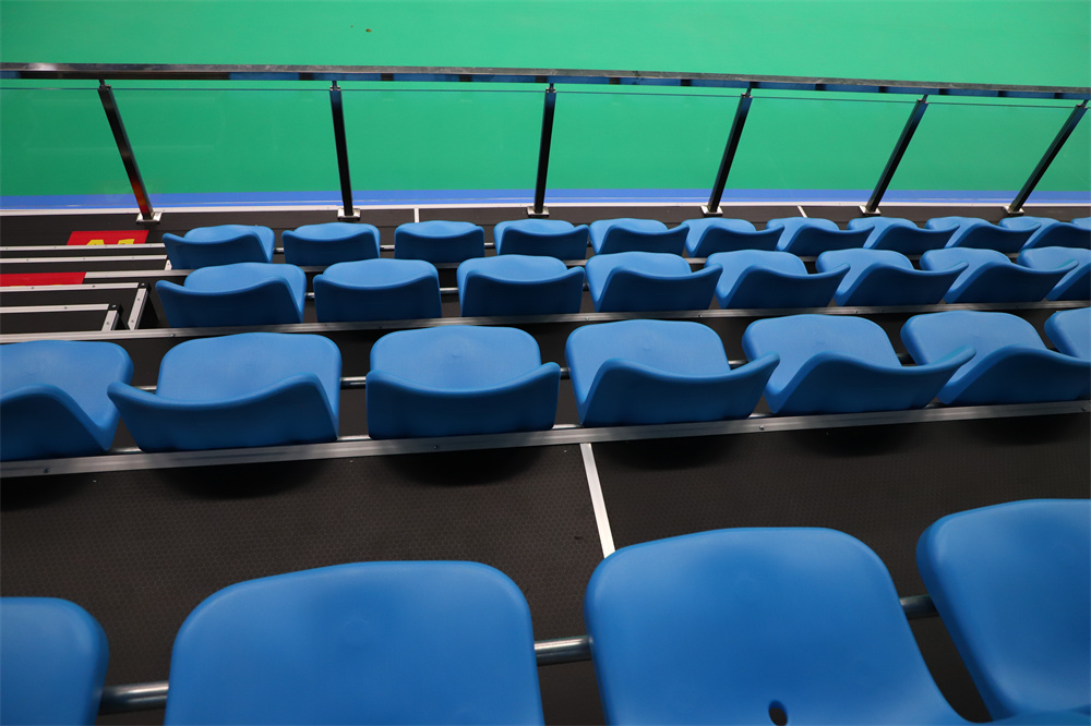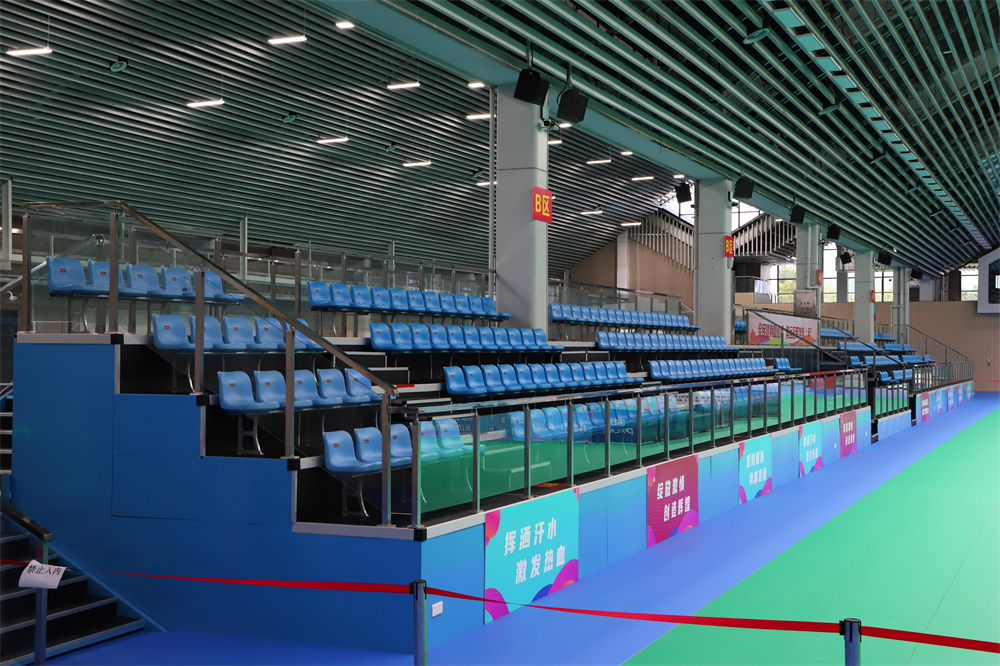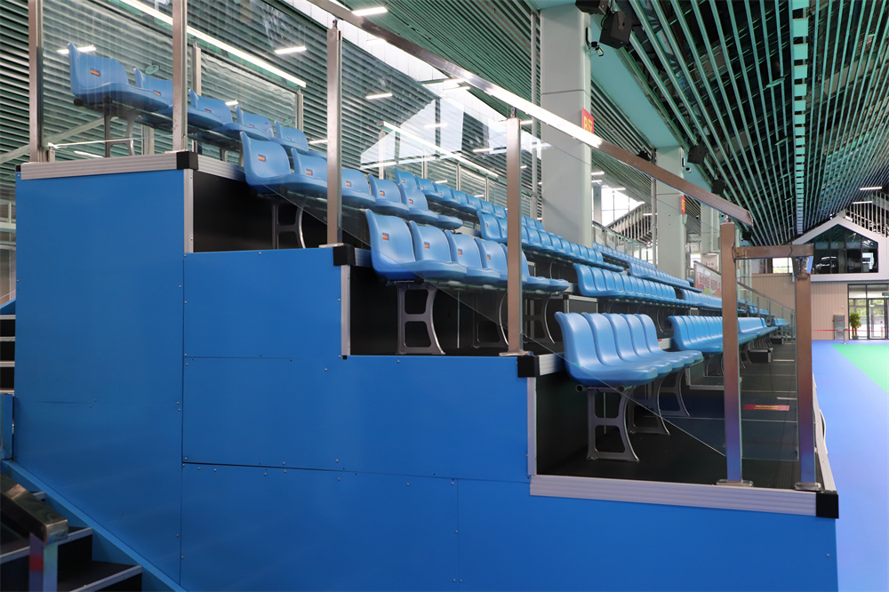 我司綠蛙看臺具體為:伸縮看臺后置式氣輔椅99位,固定金屬看臺中靠背立裝座椅687位,固定金屬看臺主席位24位。 其中固定金屬看臺在首層起高1米后,四周以金屬板全封閉,并采用和座椅同色的噴涂顏料,整體協(xié)調(diào)一致。上下通道設置在看臺側(cè)方及后方,連接區(qū)域為一條寬1.8米的通道,輔以玻璃護欄,整體高端大氣。
