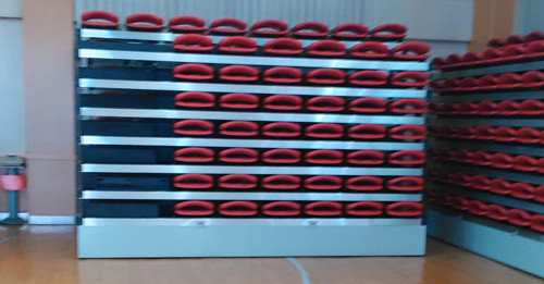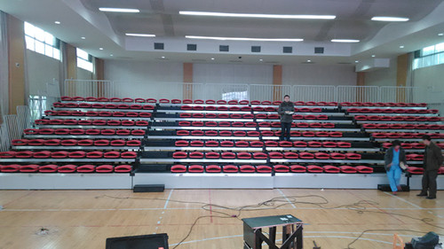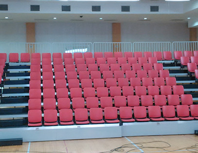 上海打虎山路第一小學(xué)體育館,采用可移動(dòng)式伸縮看臺(tái),用時(shí)4組展開拼在一起,美觀大氣,座椅采用折疊翻板靠背椅,坐感舒適。不用時(shí)分開收攏靠墻,不占地方。座椅顏色為紅色,底座灰色,整體協(xié)調(diào)。
