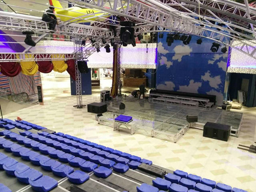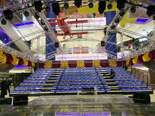 湘潭天虹百貨商場,搭建了一個小型舞臺,有桁架、燈光、音響、舞臺、看臺??蛻舻男枨笫钦w做成可拆卸可移動的。
