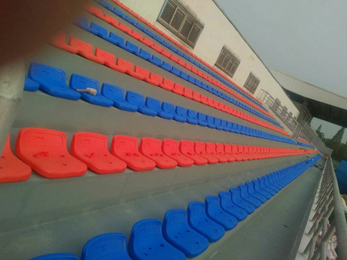 溫州職業(yè)技術(shù)學(xué)院體育場,固定式看臺,采用低靠背中空吹塑椅,藍橙搭配,美觀大方。