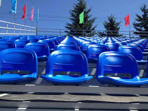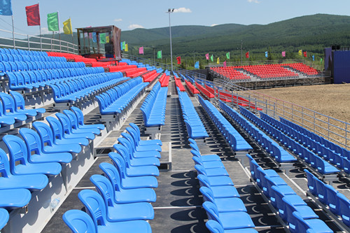 該看臺應(yīng)用于阿爾山國際馬術(shù)表演場地??磁_三面圍繞賽馬場地,總共2000位,看臺整體起高1.2米,視野開闊,方便觀眾觀看??磁_橫拉斜拉布滿,結(jié)構(gòu)穩(wěn)固,每層都安裝側(cè)檔板,保證安全可靠??磁_座椅采用紅藍搭配,顏色醒目,與草原的藍天白云配在一起。整體美觀大方。