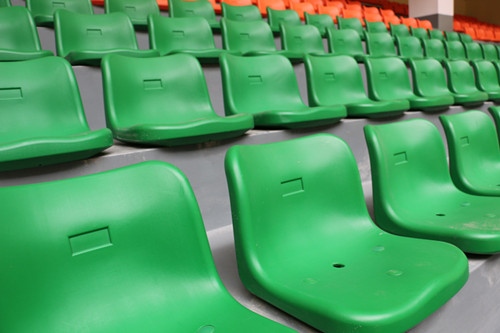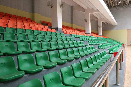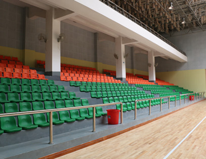 郴州六中學(xué)校體育館采用固定看臺(tái),中靠背中空吹塑椅,綠色與橙色相結(jié)合,營造出活潑動(dòng)感的氛圍,與運(yùn)動(dòng)木地板渾然一體。