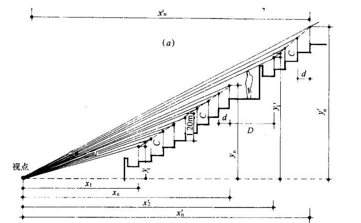 從使用方便和安全考慮 ,每臺階高度與臺階深之比不宜大于 1 : 1. 5,其實際尺寸高不宜大于60cm,最小高度不宜小于25cm,上下臺階高度差值宜以lcm為單位,以便施工??磁_視線設 計考慮到計算假設條件失真,如人體標準身高1.7m,座高 1.3m等以及運動項目和觀看地面面積大小不同等因素,在實際使用時觀眾能自行調(diào)整角度和方位。因而只要掌握好設計基本原則就能收到較好的效果 。因此計算方法不宜過于精確 ,而給建筑施工增加不必要的難度。