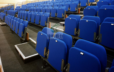B、可移動式伸縮看臺,一般不超過8層,配置軟包椅或者塑料椅,一般為前置式。
