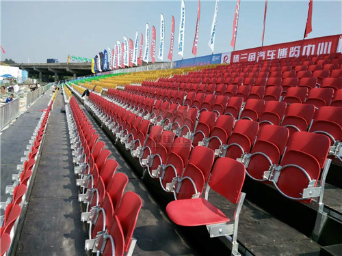 該賽場的看臺選用我司的可拆卸拼裝臨時租賃看臺,其設(shè)計為12層,可容納2000人的觀眾,看臺首層起高1.2米,視野開闊,精彩節(jié)目一覽無余。看臺層與層之間鋼板封閉,觀眾站在看臺上完全見不到地面,從而沒有任何站在高處的恐懼感。