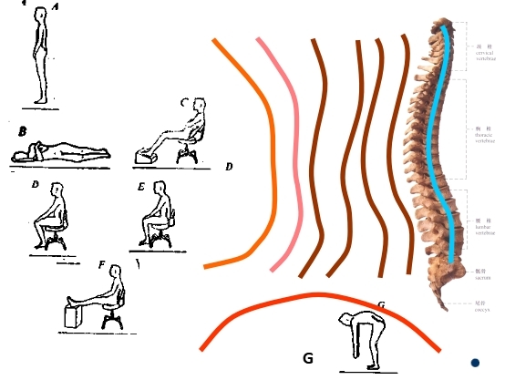 2.2、當(dāng)處于非自然姿時(shí),椎間盤內(nèi)壓力分布不正常,形成的壓力梯度,嚴(yán)重的會(huì)將椎間盤從腰椎之間擠出來,壓迫中樞神,產(chǎn)生腰部酸痛、疲勞等不適感。軀干完全挺直的坐姿使脊椎嚴(yán)重彎曲,因椎間盤上壓力不能正常分布,身體上部的負(fù)荷加在腰椎部,引起不適,因此90度角的靠背椅是不良的設(shè)計(jì),軀干前傾的姿勢(shì)會(huì)使本來前凸的腰椎拉直甚至反向后凹,這種姿勢(shì)因而也極不舒服,影響了胸椎和頸椎的正常彎曲,使頸、背部疲勞.