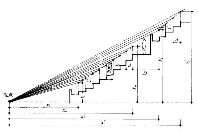 我們認(rèn)為在 C值中可以不考慮h3的因素,除了上述原因外,還因為大型運動場的大部分座位是不對號坐的,一般人一定不會坐在比自己高得多的人后面。而將自由選擇合適的座位坐在與自己身材高矮差不多的人后面。而且當(dāng)前面觀眾坐的姿式變動時。自己也可以相應(yīng)的變動姿式,來滿足視線要求。