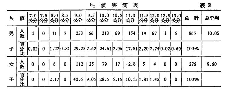 h1值是決定C值的重要組成部分,目前一般都認(rèn)為是12公分。這些數(shù)字都是從國外資料中得來的,為了求得我國人體的h1值,對1143名人員進(jìn)行了實測,其對象選擇為青少年和成年人,實測記錄見表3:
