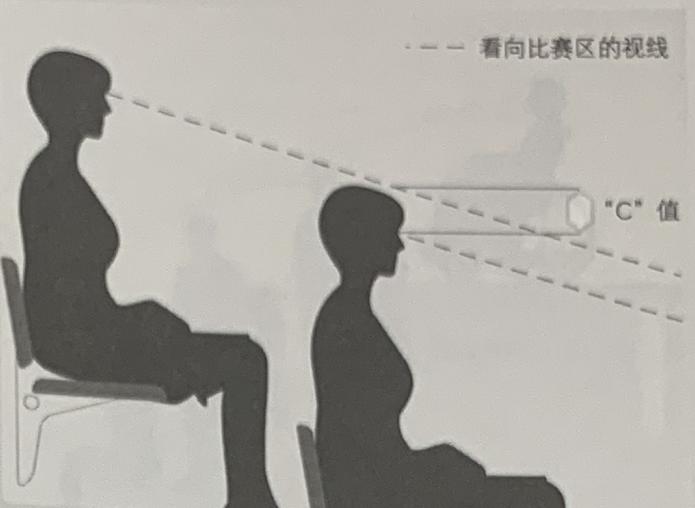 視線一詞指的一個觀眾越過下面觀眾頭頂看到比賽場地的一個關(guān)鍵點的能力,它是通過“C”來測量的,如下圖。