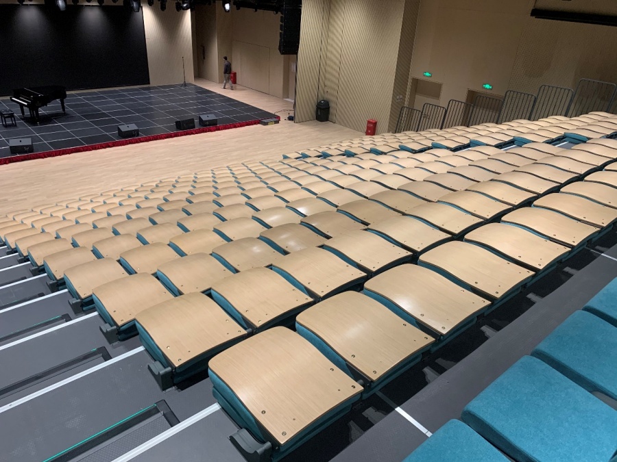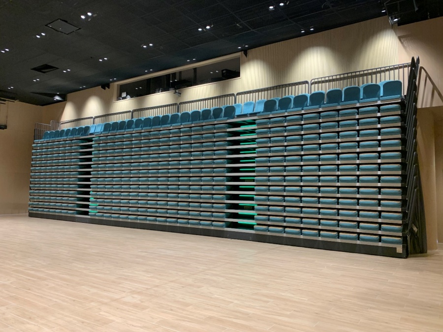 看臺(tái)總共是13排,可容納觀眾394人。上面配置有兩條通道。通道上面的踏步上裝有燈帶,方便在光線昏暗的情況下觀眾的出入??磁_(tái)收攏后的深度只有1.5米,整體像一面墻一樣壯觀??磁_(tái)收攏后騰出了巨大的空間,可以做其他的功能使用,大大增加了場(chǎng)地的使用效率。