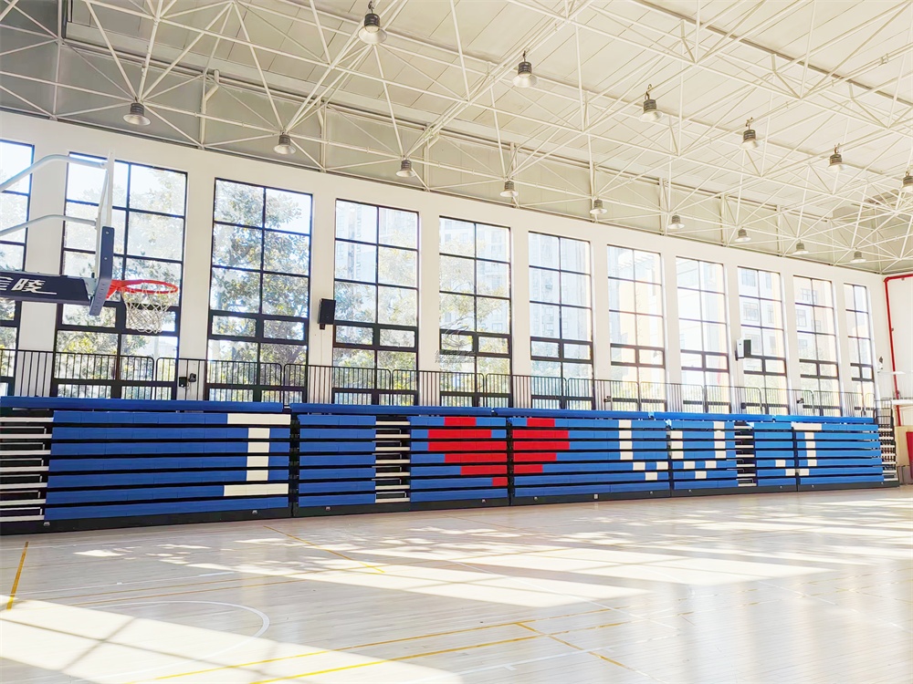 學(xué)校體育館建成多年,一直沒(méi)有設(shè)置成規(guī)模的觀眾席看臺(tái)。在綠蛙看臺(tái)的建議下,學(xué)校決定在原體育館增加伸縮看臺(tái)。本活動(dòng)看臺(tái)采用鋼焊接組裝連接,所有安裝用鋼件均采用靜電噴涂處理,層寬700mm,尾層寬400mm。首層高330mm,錯(cuò)層高300mm, 活動(dòng)看臺(tái)踏板材料選用17mm防火防滑舞臺(tái)板。