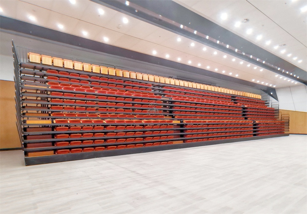 看臺層寬950mm,首層高330mm,錯層高300mm,看臺踏板材料選用17mm夾層板,表面顏色為木色;伸縮看臺為電動控制,保證左右行走距離一致,在伸展與回縮中無定向跑偏、卡死、打滑、跳齒現(xiàn)象