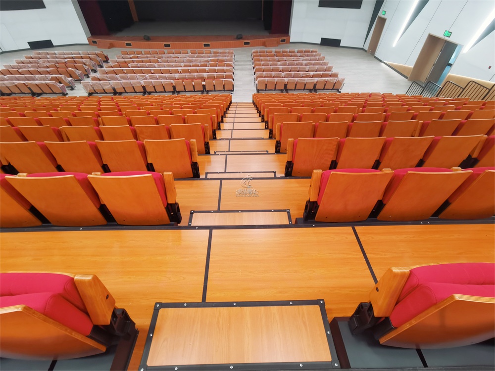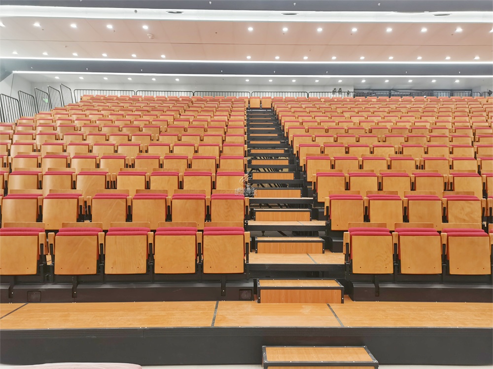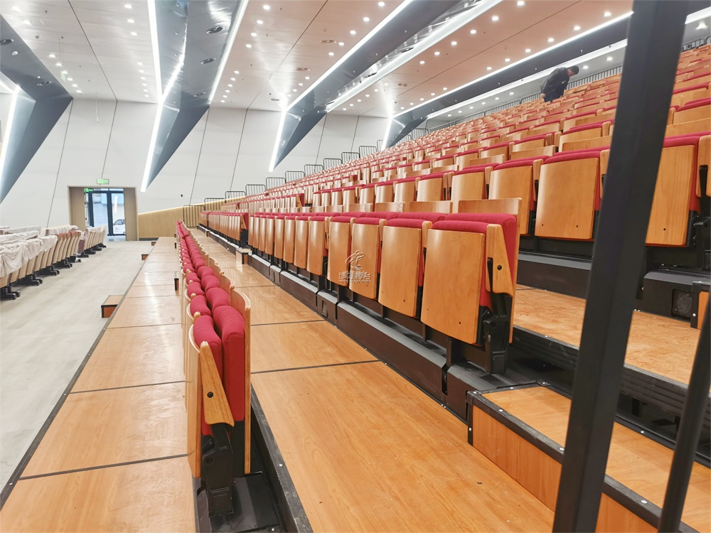 伸縮看臺座椅采用軟包座椅,帶扶手,座包和背包車線條,外掛弧面油漆板,靠背油漆板外凸,中間位置裝座號,后置式安裝方式。