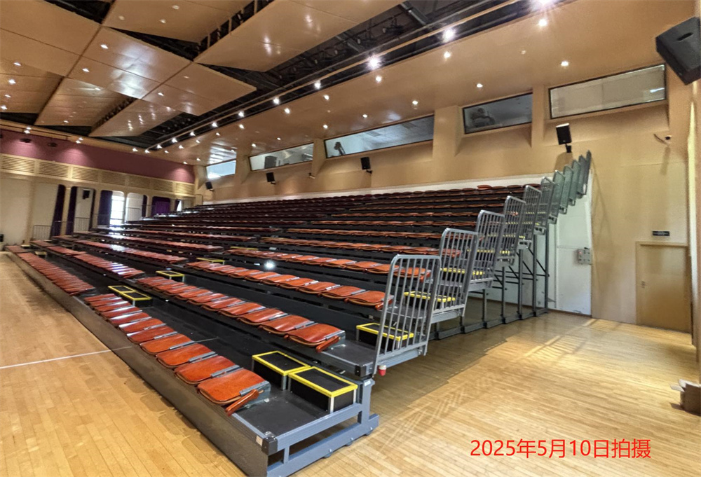 伸縮看臺整體為12排,可容納550人,座椅采用前置式翻板包棉座椅,帶扶手??磁_展開后可以用作開大會、文藝晚會等活動,看臺收攏后,騰出的空間可用作各班級上文體課。