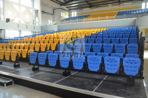 伸縮看臺(tái)又分為座椅前置式安裝和座椅后置式安裝。前置式伸縮看臺(tái)主要是指座椅直接固定在活動(dòng)看臺(tái)床架上,以低靠背、平靠背、靠背可翻轉(zhuǎn)折疊椅、鋁合金座板等座椅椅面選擇為主。后置式伸縮看臺(tái)主要用于對(duì)層高要求比較窄,且追求高檔的情形下。