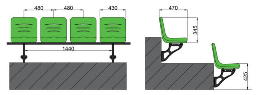 座椅采用側(cè)裝方式的座椅,椅面距地面高度約為420mm左右,座椅支架選用優(yōu)質(zhì)壓鑄鋁支架連接鍍鋅圓管。壓鑄鋁支架采用靜電噴塑處理。支架采用M10×80的擊芯膨脹螺栓與看臺(tái)水泥壁面相連,每個(gè)膨脹螺栓可抗力100kg以上。鍍鋅圓管外徑不少于φ32mm,厚度不少于2mm。圓管兩端采用橡膠塞頭封口。緊固件、座椅連接件采用鍍鋅處理。