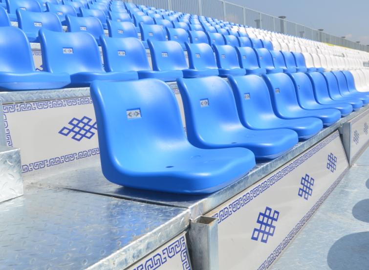 6、看臺的層寬為800-850mm。座椅采用中靠背吹塑椅,前置式安裝方式。單個座椅尺寸為:座寬410mm±5mm,座深450mm±5mm,背高310mm±5mm,座距480mm±5mm。
