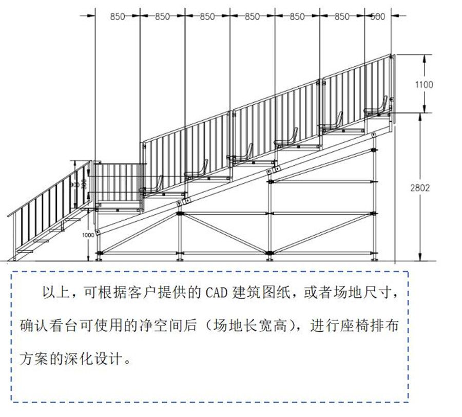1、看臺采用方便拆卸的結(jié)構(gòu)。整體結(jié)構(gòu)需采用標(biāo)準(zhǔn)件、模塊化設(shè)計,看臺的各種部件,如支架,踏板,側(cè)板,護(hù)欄,座椅等,皆可隨意搭配組裝,可根據(jù)場地及觀眾席位需要進(jìn)行各種層高、位數(shù)的拼裝組合。