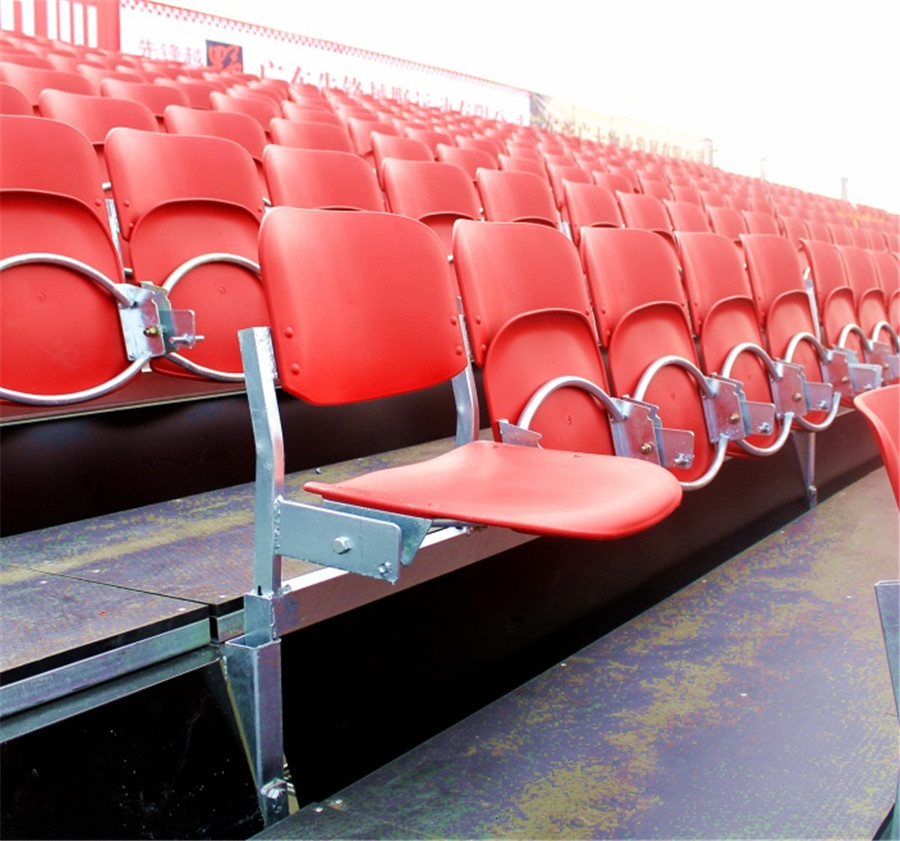 6、看臺的層寬為763mm±5mm。座椅采用翻板注塑椅,后置式安裝方式,即座椅安裝于每層的后端,每層的前端是通道。座椅不使用時翻折起來,空出更寬的通道,方便疏散。單個座椅尺寸為:座寬455mm±5mm,座深490mm±5mm,背高410mm±5mm,座距455mm±5mm。座椅采用高強度聚丙烯材料加阻燃劑。座椅5個一組,由金屬支架連成一體。座椅安裝時只需插在看臺支架的相應孔位,不需要任何螺絲固定。