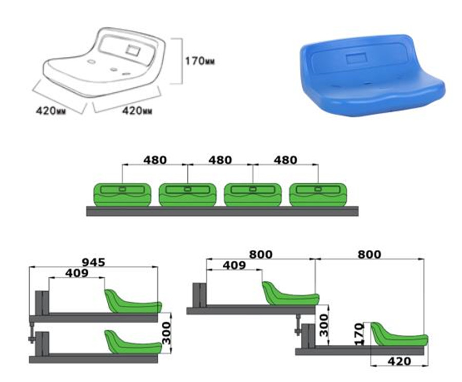 活動看臺座椅采用低靠背中空吹塑座椅,前置式安裝。座椅上有三個安裝孔,透過座椅安裝孔將座椅直接安裝在看臺的踏板上,不需要任何金屬連接片。