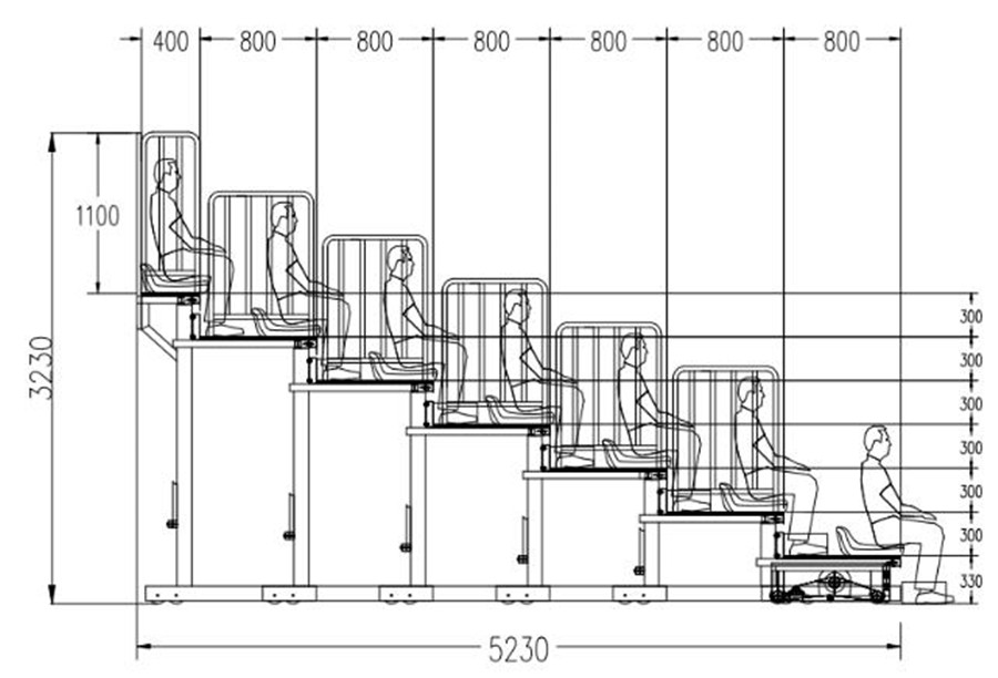 (2)看臺整體為垂直支撐結構。看臺層寬800mm,尾層寬400mm;首層高330mm,其他層高300mm。(伸縮看臺為定制產品,可根據(jù)實際場地和客戶需求,略微調整尺寸。)
