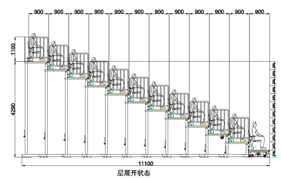 (2)看臺(tái)整體為垂直支撐結(jié)構(gòu)??磁_(tái)層寬900mm;首層高330mm,其他層高300mm-360mm。(伸縮看臺(tái)為定制產(chǎn)品,可根據(jù)實(shí)際場(chǎng)地和客戶需求,略微調(diào)整尺寸。)