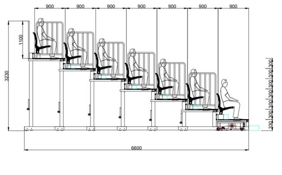 (2)看臺整體為垂直支撐結(jié)構(gòu)。看臺層寬900mm,尾層寬900mm;首層高330mm,其他層高300mm。(伸縮看臺為定制產(chǎn)品,可根據(jù)實際場地和客戶需求,略微調(diào)整尺寸。)