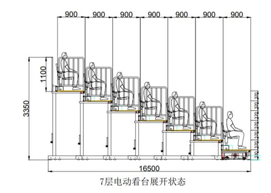 (2)看臺整體為垂直支撐結(jié)構(gòu)??磁_層寬900mm,尾層寬900mm;首層高330mm,其他層高300mm。(伸縮看臺為定制產(chǎn)品,可根據(jù)實(shí)際場地和客戶需求,略微調(diào)整尺寸。)
