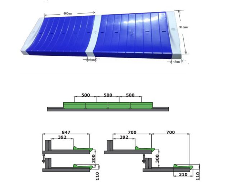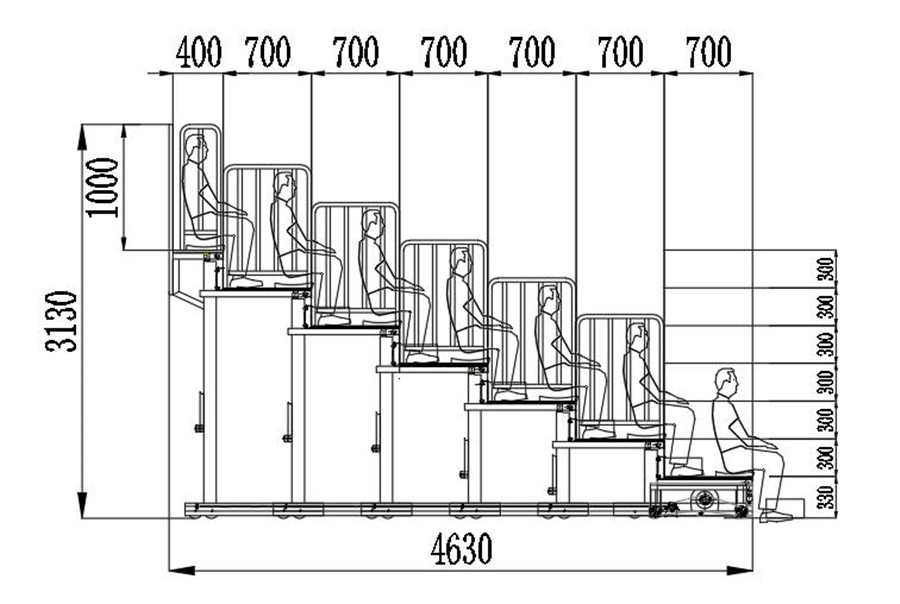 (2)看臺整體為垂直支撐結(jié)構(gòu)。看臺層寬700mm,尾層寬400mm;首層高330mm,其他層高300mm。(伸縮看臺為定制產(chǎn)品,可根據(jù)實際場地和客戶需求,略微調(diào)整尺寸。)