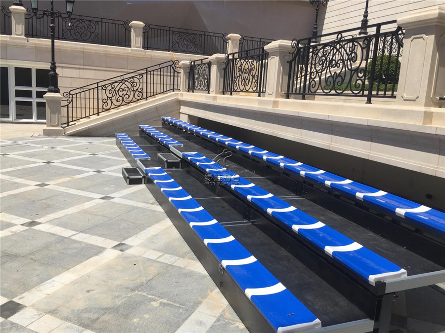 活動看臺座椅采用平靠背注塑座椅,前置式安裝。座椅兩端各有一個安裝孔,透過座椅安裝孔將座椅直接安裝在看臺的踏板上,不需要任何金屬連接片。