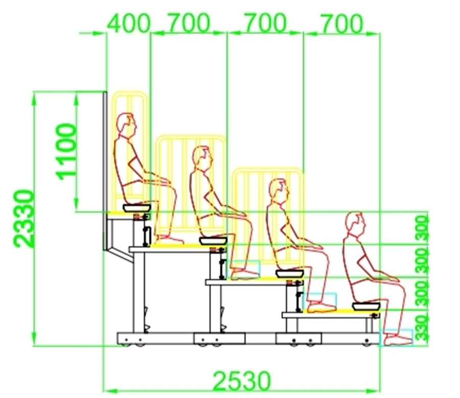 (2)看臺(tái)整體為垂直支撐結(jié)構(gòu)。看臺(tái)層寬700mm,尾層寬400mm;首層高330mm,其他層高300mm。(伸縮看臺(tái)為定制產(chǎn)品,可根據(jù)實(shí)際場地和客戶需求,略微調(diào)整尺寸。)