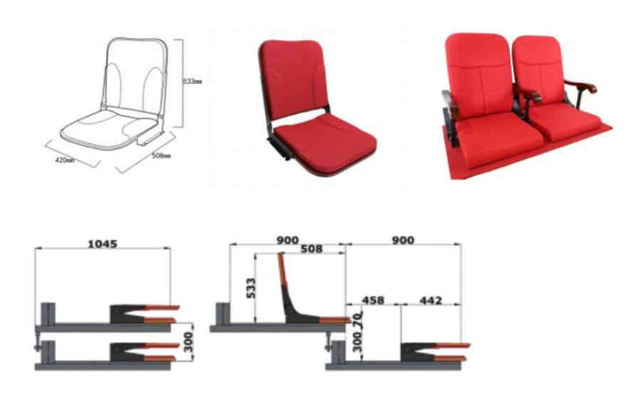 3)座椅尺寸:活動看臺座椅采用高靠背包棉翻板折疊座椅,前置式安裝。座椅背高533mm,座深508mm,座寬420mm。允許±10mm偏離。以下為伸縮看臺座椅尺寸示意圖。請?zhí)峤粯悠贰?/span>