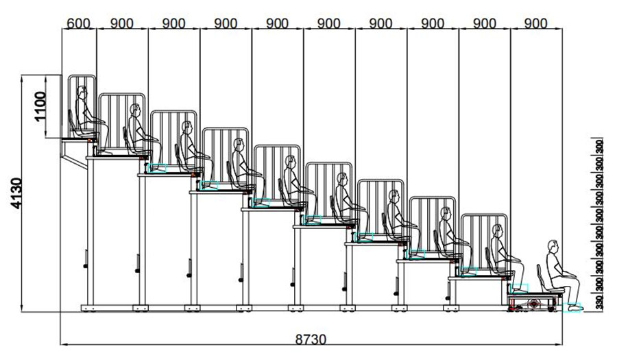 (2)看臺整體為垂直支撐結(jié)構(gòu)??磁_層寬900mm,尾層寬600mm;首層高330mm,其他層高300mm。(伸縮看臺為定制產(chǎn)品,可根據(jù)實際場地和客戶需求,略微調(diào)整尺寸。)