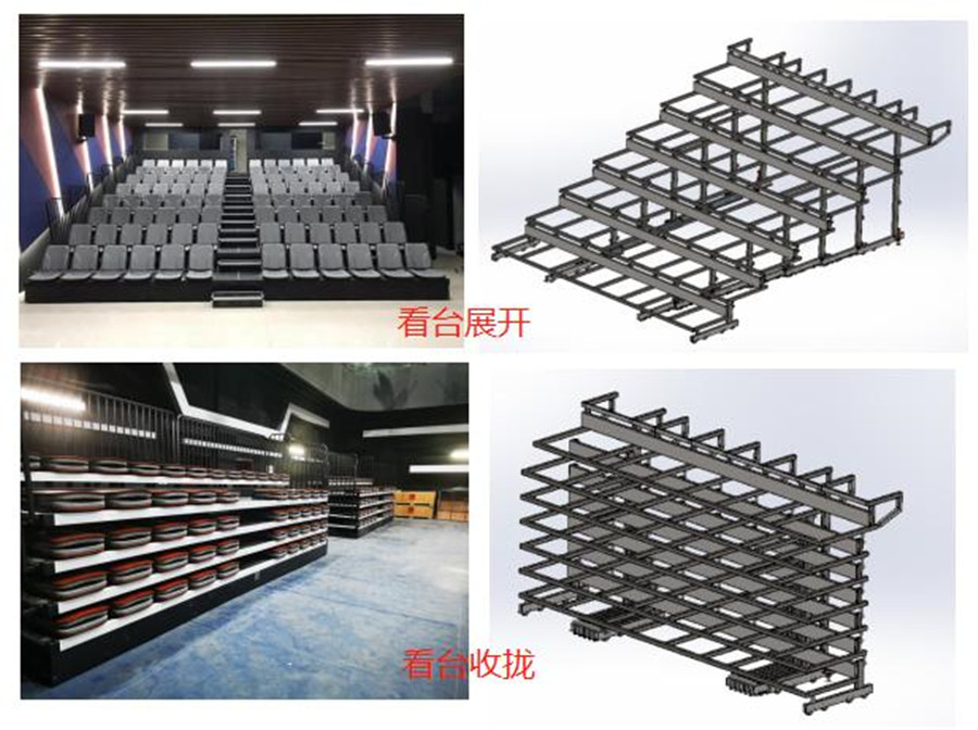 伸縮看臺也稱為活動看臺,活動看臺的稱呼是相對于固定看臺而來,伸縮看臺拉伸成臺階形時,看臺上的座椅供觀眾舒適地欣賞節(jié)目,收縮成匣子狀(似抽屜)時則占用很少的空間,讓出場地以安排他用。伸縮看臺可充分利用室內(nèi)的有限面積,滿足不同功能情況下的多座位要求。伸縮看臺廣泛應(yīng)用于體育館、會議室、示教室、演播廳、多功能廳等。