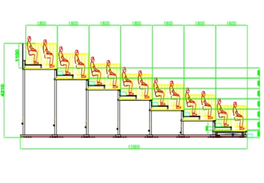 (2)看臺(tái)整體為垂直支撐結(jié)構(gòu)??磁_(tái)層寬1800mm,一層擺雙排后置式座椅,同一層雙排座椅高差200mm,首層高330mm,其他層高400mm。